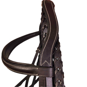 La bride Paragon Performance Caesar Wide Brow Rembourré Fancy Stitched Tapered Hunter/Jumper est un bridon ergonomique mono-couronne doté de surpiqûres fantaisie couleur crème sur un nez et un frontal extra-larges, effilés et rembourrés offrant un confort supplémentaire en répartissant uniformément la pression sur le visage et la nuque. Livré complet avec du matériel en acier inoxydable durable et des rênes à lacets. Mors non inclus.