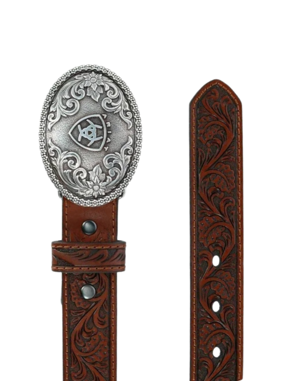 • Boucle amovible : Boucle ovale en argent avec logo Ariat et accents floraux.