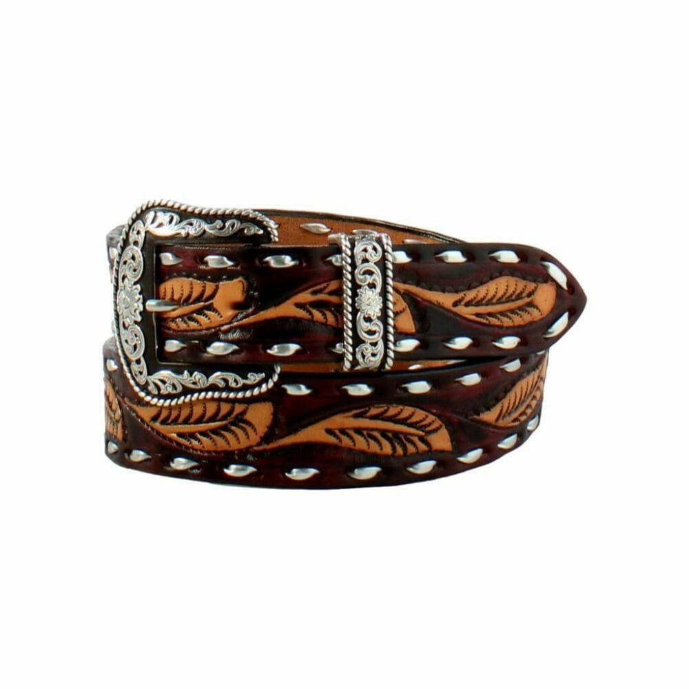 La ceinture pour femmes Angel Ranch Western Belt est parfaite pour les cowgirls. Fabriquée par M&F Western Products, elle arbore une sangle rouge foncé avec un aspect vieilli et un motif de feuille sculptée à la main. Le bord extérieur de la ceinture est orné d'une couture en forme de boucle. Son code de référence est D1400046207. Avec son style authentique et sa qualité remarquable, cette ceinture ajoutera une touche de charme western à toute tenue.
