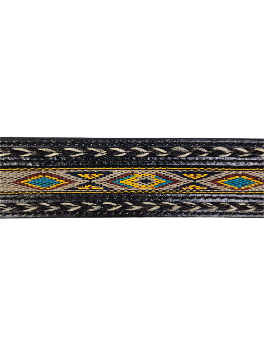 Charmante ceinture en cuir travaillé en arborant un beau tissage aztèque et des tresses en crin de cheval. Une boucle de ceinture y est fournie et est facilement remplaçable grâce à son système de bouton-pression universel.