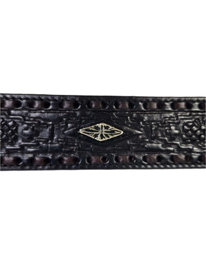 Charmante ceinture en cuir travaillé en arborant de joli concho de forme losange. Une boucle de ceinture y est fournie et est facilement remplaçable grâce à son système de bouton-pression universel.