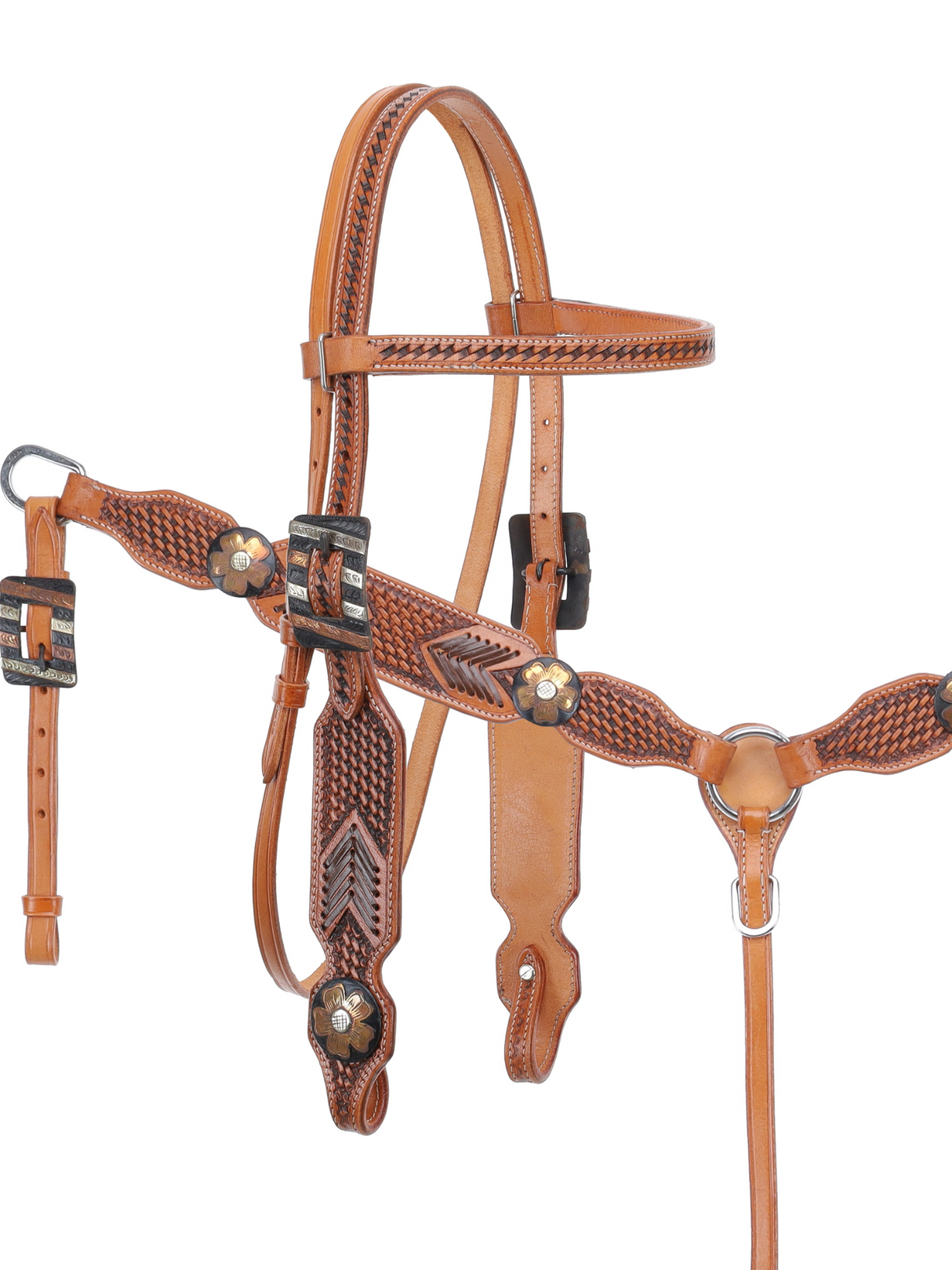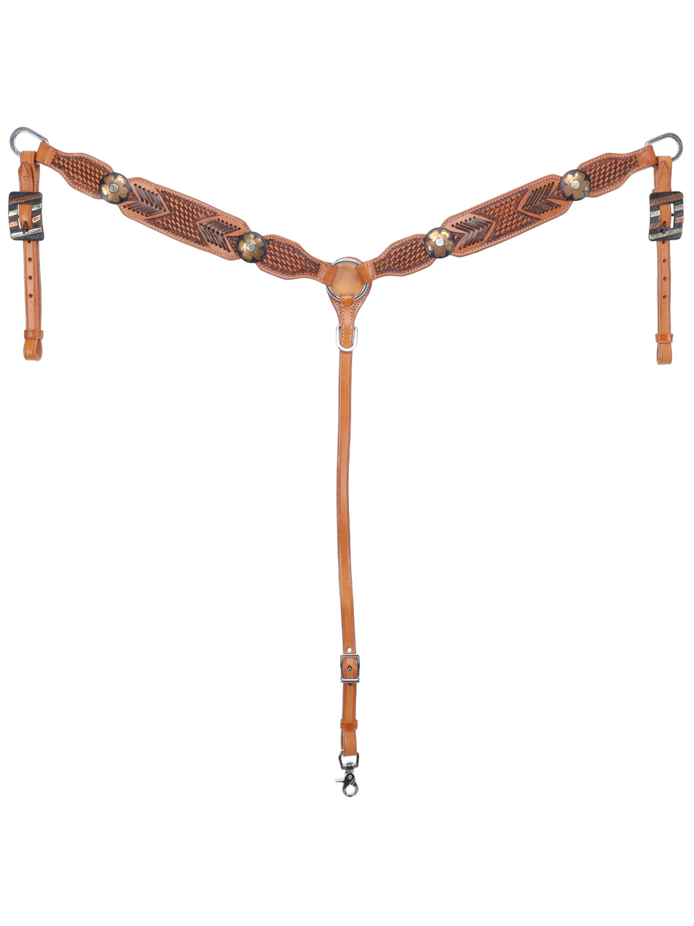 Le bride frontale est ornée de conchos vieillis ornés de fleurs cuivrées, apportant une touche à la fois rustique et raffinée. Les montants réglables sont munis de boucles à barrettes en argent et cuivre vieillis, alliant fonctionnalité et style. La bricole complète la bride avec ses tirettes réglables et sa sangle centrale, permettant un ajustement personnalisé selon les besoins de votre cheval.