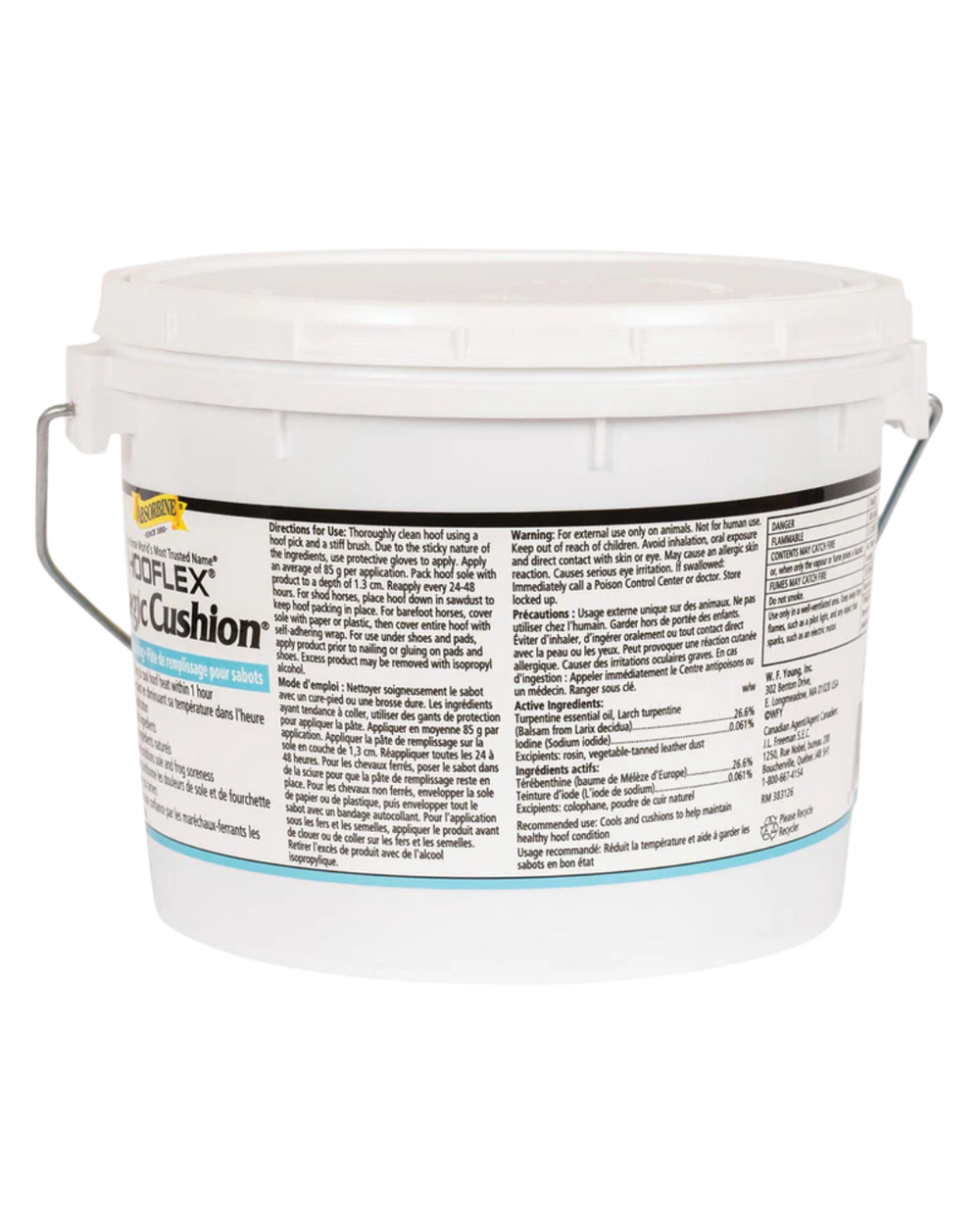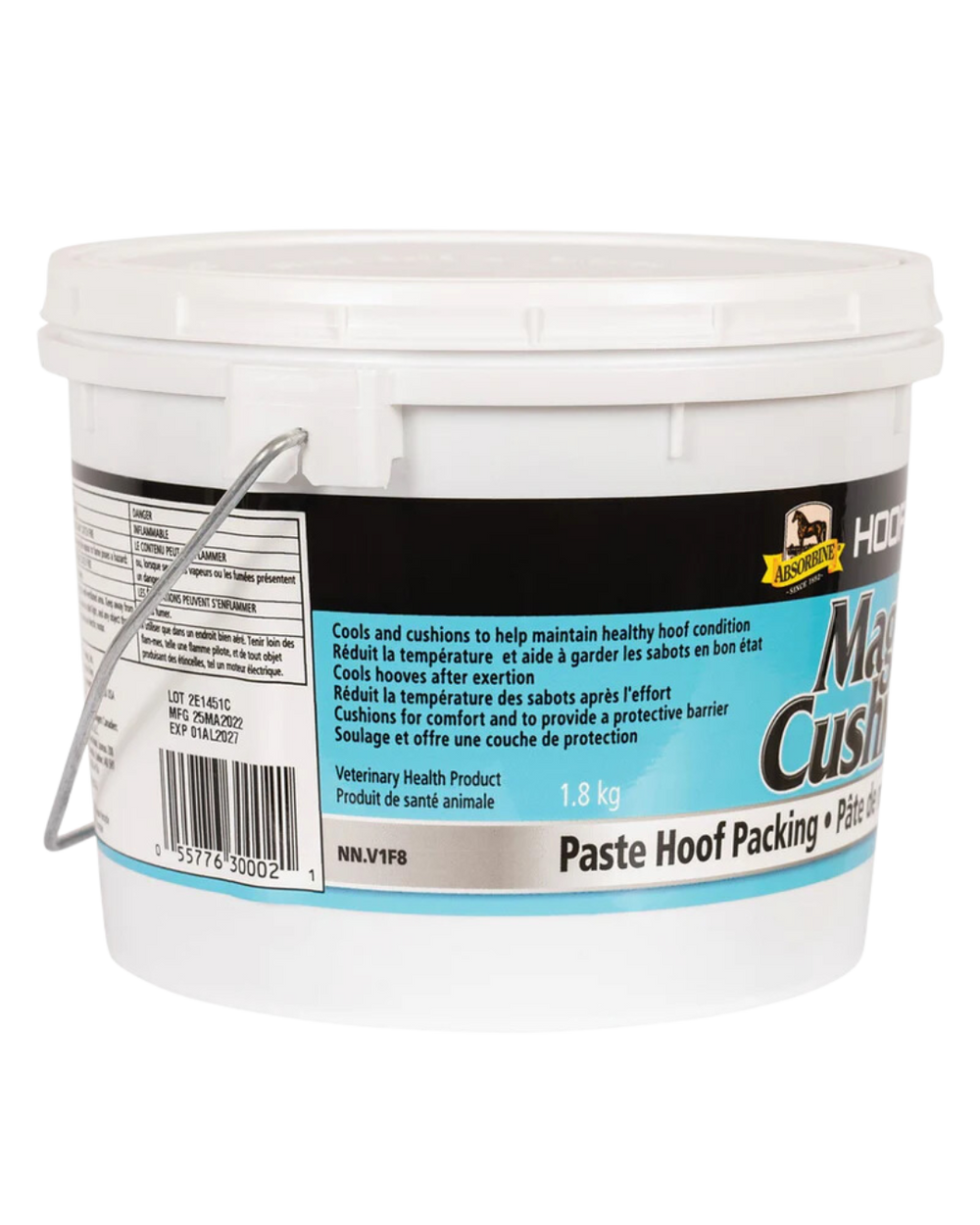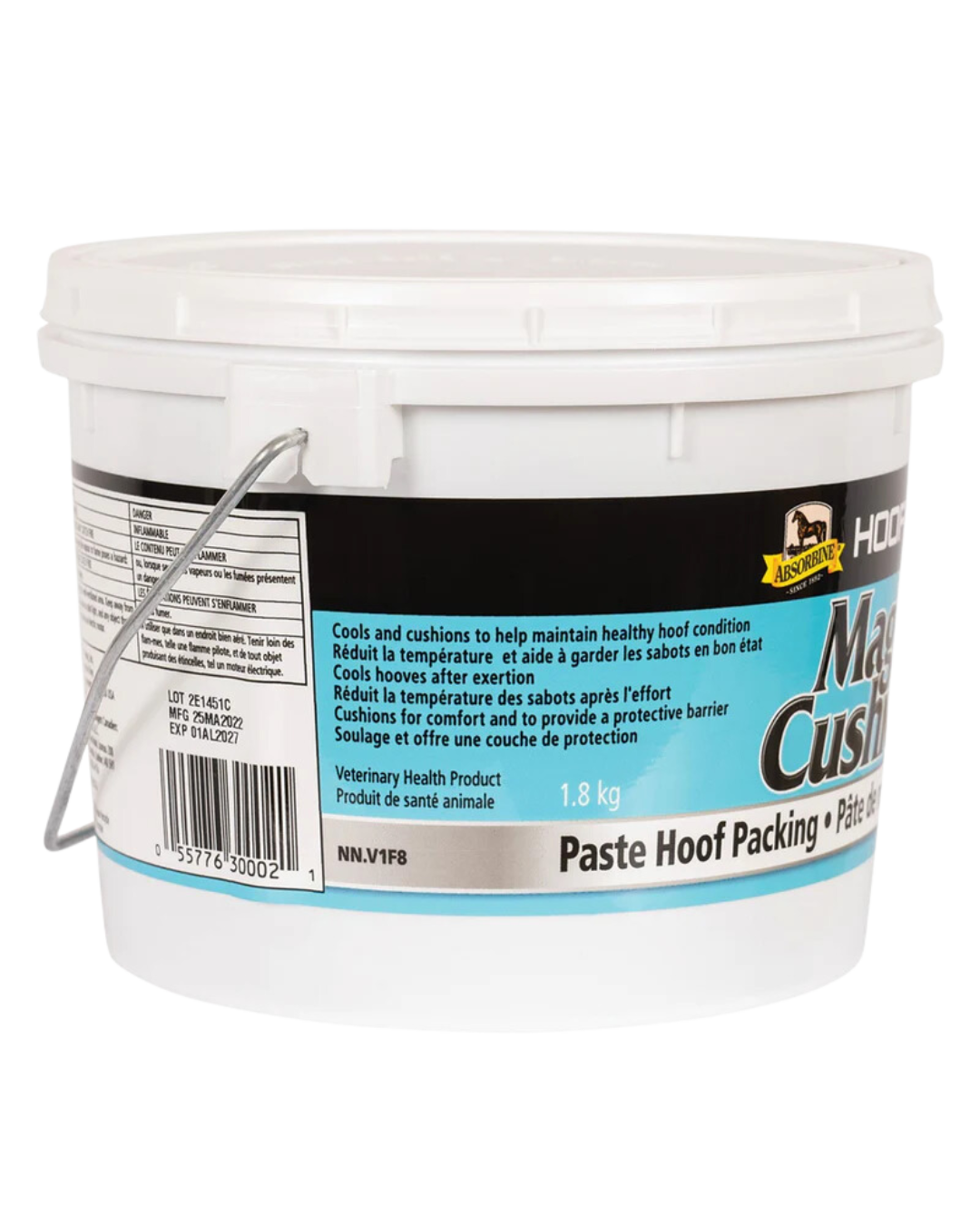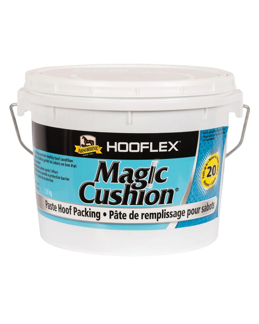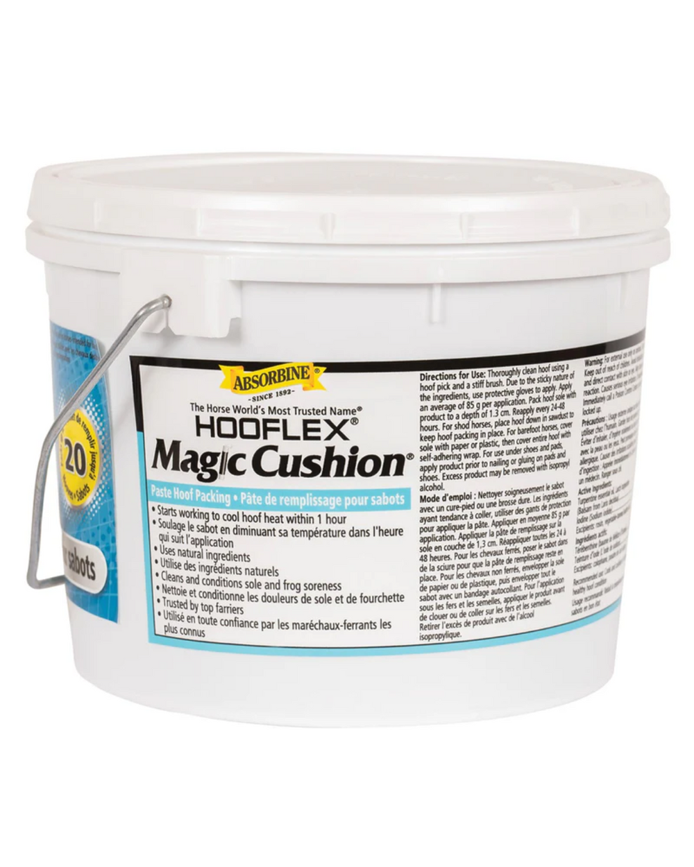 Formulé par des vétérinaires pour agir comme par magie sur les pieds fatigués, le Magic Cushion® pour sabots commence à réduire la chaleur du sabot en une heure, et continue d'agir pendant jusqu'à 24 heures. Son action rafraîchissante et amortissante procure un soulagement rapide et apaisant pour les sabots très sollicités. Chaque seau de quatre livres offre un excellent rapport qualité-prix, contenant suffisamment de produit pour environ 20 applications ! C'est l'un des 5 produits les plus recommandés par les maréchaux-ferrants à leurs clients, selon l'enquête sur les pratiques commerciales du American Farriers Journal de 2014.
