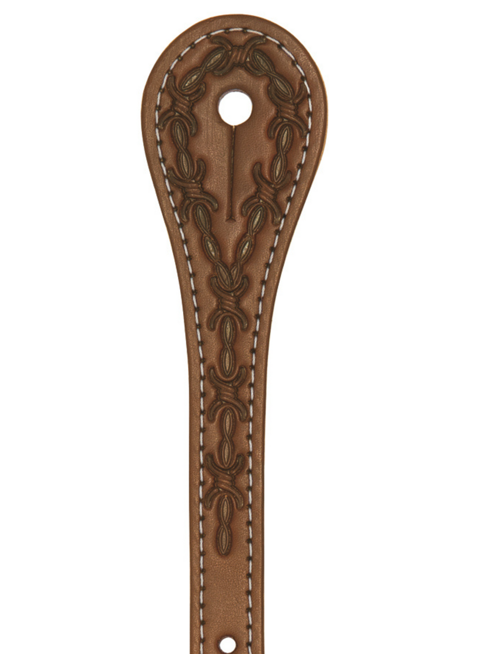 Ces gances d’éperons allient style affirmé et savoir-faire artisanal. Fabriquées en cuir skirting brun huilé, elles sont mises en valeur par un motif barbelé profondément estampé à la main. Leur design mince apporte une touche épurée et moderne, parfait pour compléter votre équipement western avec caractère.