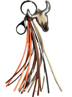 Porte clés avec franges en faux cuir et tête de long horn