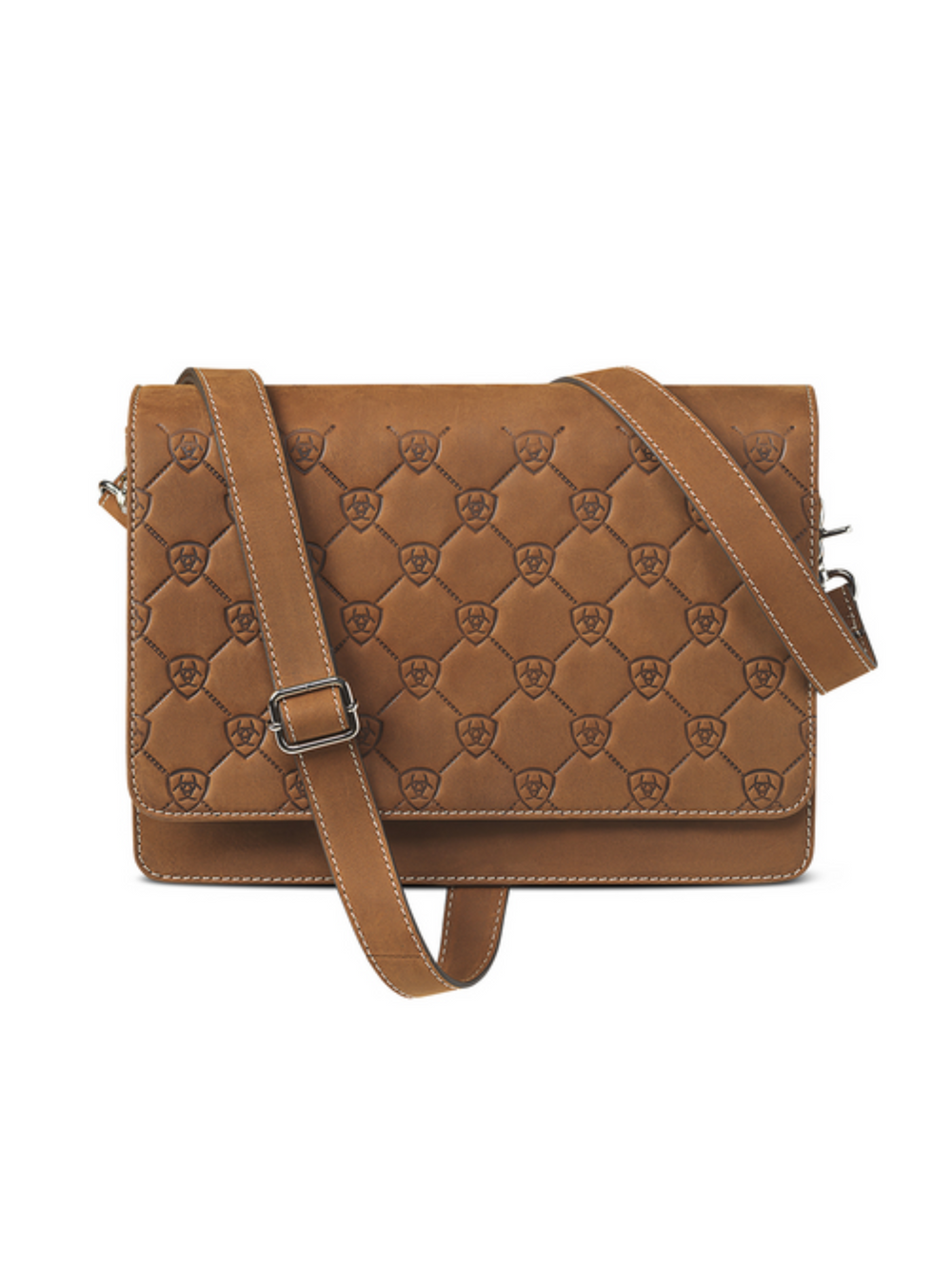 Le sac bandoulière Selma petit format Ariat pour femme, brun moyen, en cuir embossé, est pratique, chic et ajustable.